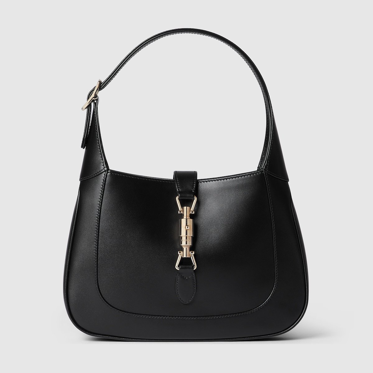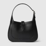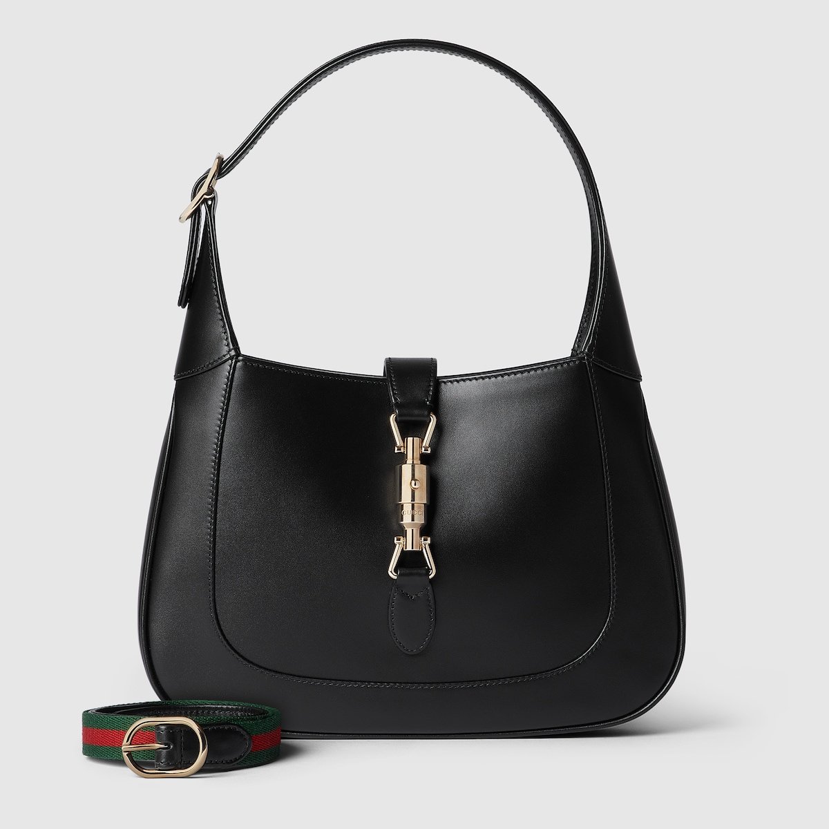 The new Gucci Jackie 1961 is crafted from premium fine leather which highlights the craftsmanship, crescent shape, and sleek silhouette of the House’s iconic shoulder bag. Light gold-toned hardware, leather trim, and an additional Web strap gives this Jackie 1961 small shoulder bag in black leather further styling options.