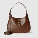 The new Gucci Jackie is crafted from fine leather which highlights the craftsmanship, crescent shape, and sleek silhouette of the House’s iconic shoulder bag. Light gold-toned hook closure, leather trim, and an additional strap featuring the green and red Web gives this Gucci Jackie small shoulder bag in brown leather further styling options.