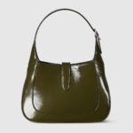In the Spring Summer 2025 collection, this Gucci Jackie 1961 small shoulder bag is crafted from forest green patent leather, complete with light gold-toned hook closure and an additional strap.