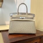 This Birkin is in Beton and Gris Asphalte ostrich with brushed gold hardware and features contrast and tonal stitching.front flap. two straps with center toggle closure. clochette with lock and two keys. and double rolled handles.
