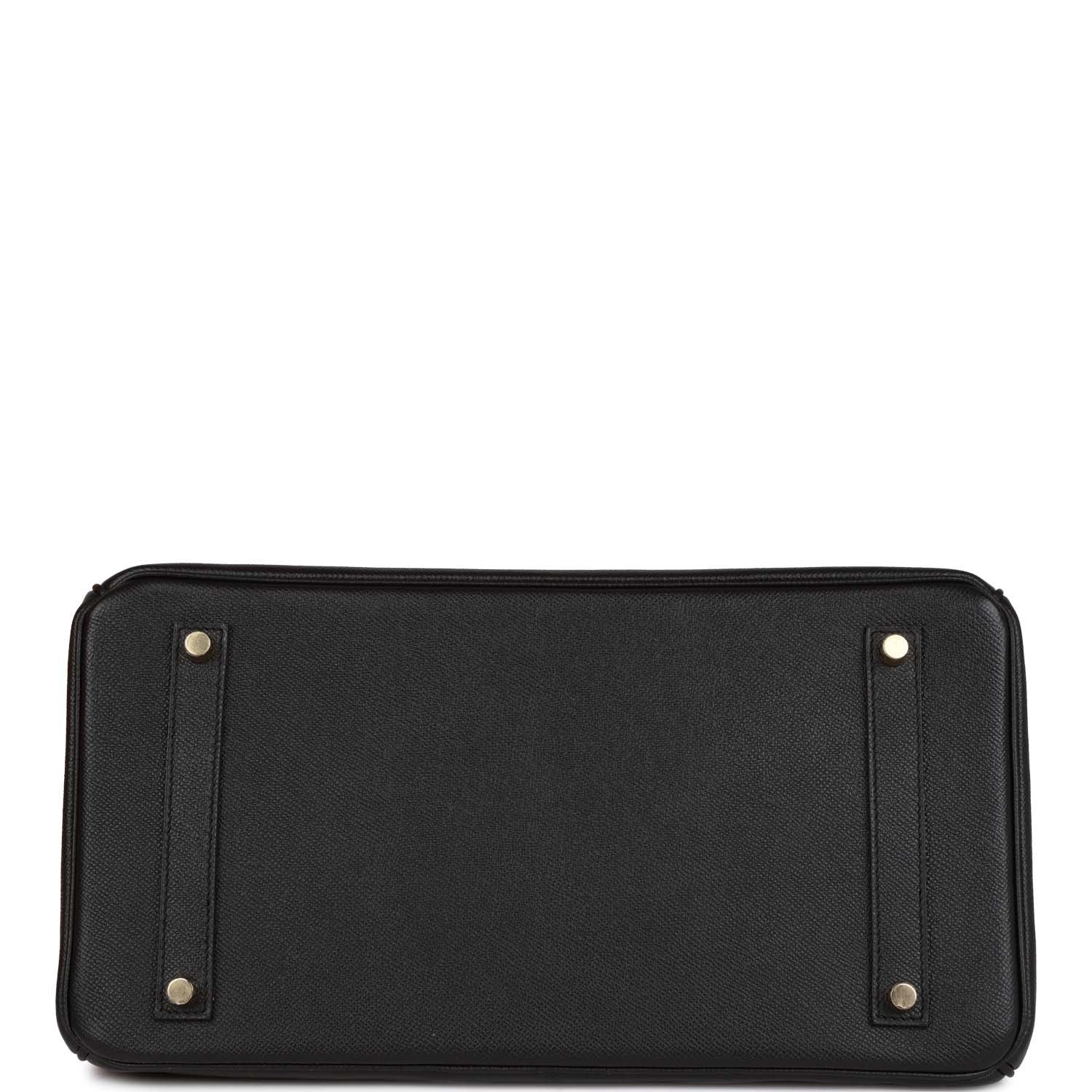 This Birkin is of black epsom leather with gold hardware and features tonal stitching.front flap. two straps with center toggle closure. clochette with lock and two keys. and double rolled handles.