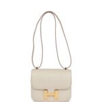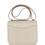 This Constance is of Beton matte alligator with gold hardware and features tonal stitching. a H snap lock closure. and an adjustable shoulder strap.