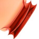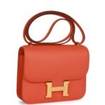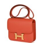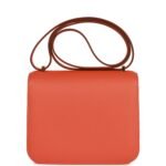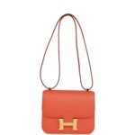 This Constance is in Orange swift leather with gold hardware and has tonal stitching. a metal H snap lock closure and adjustable shoulder strap.