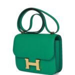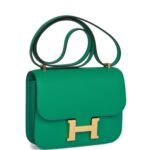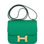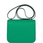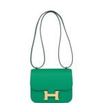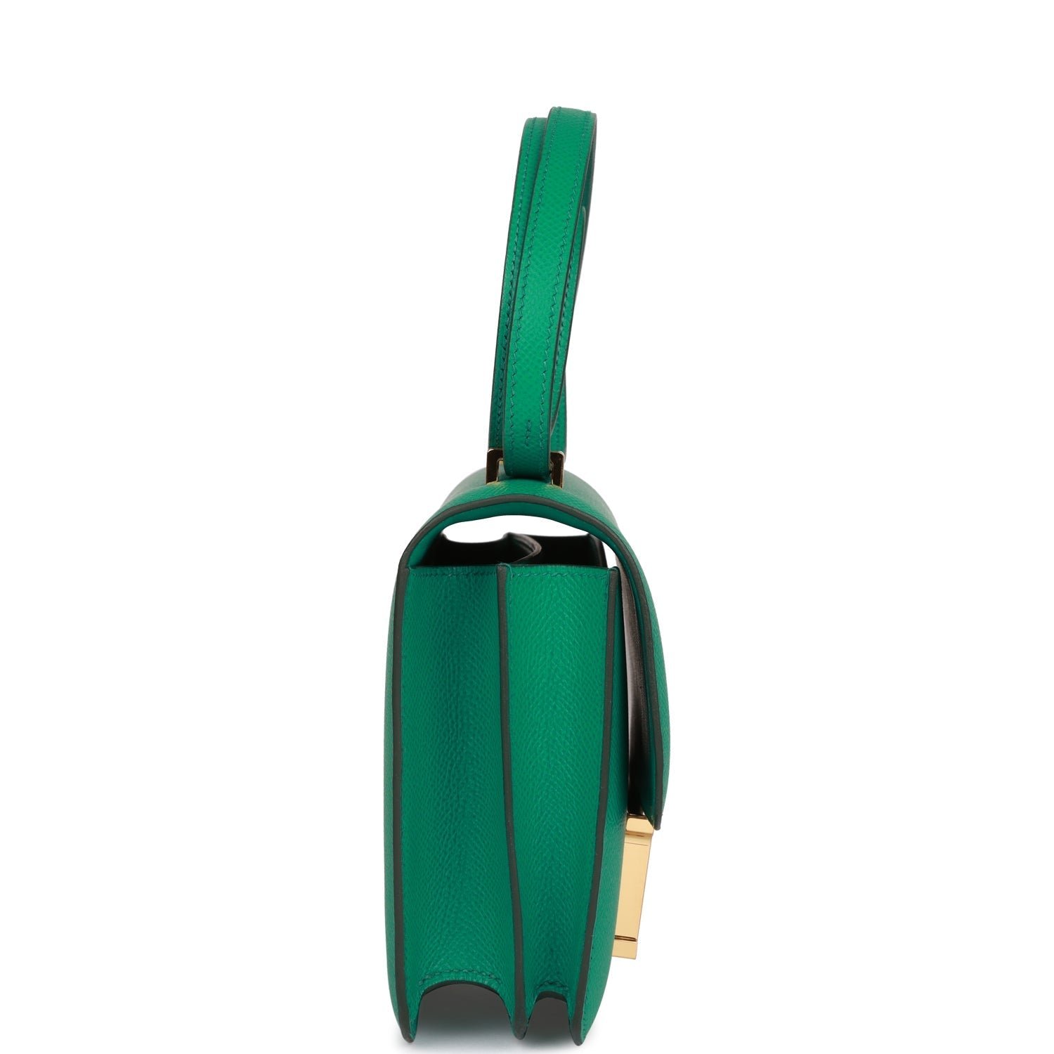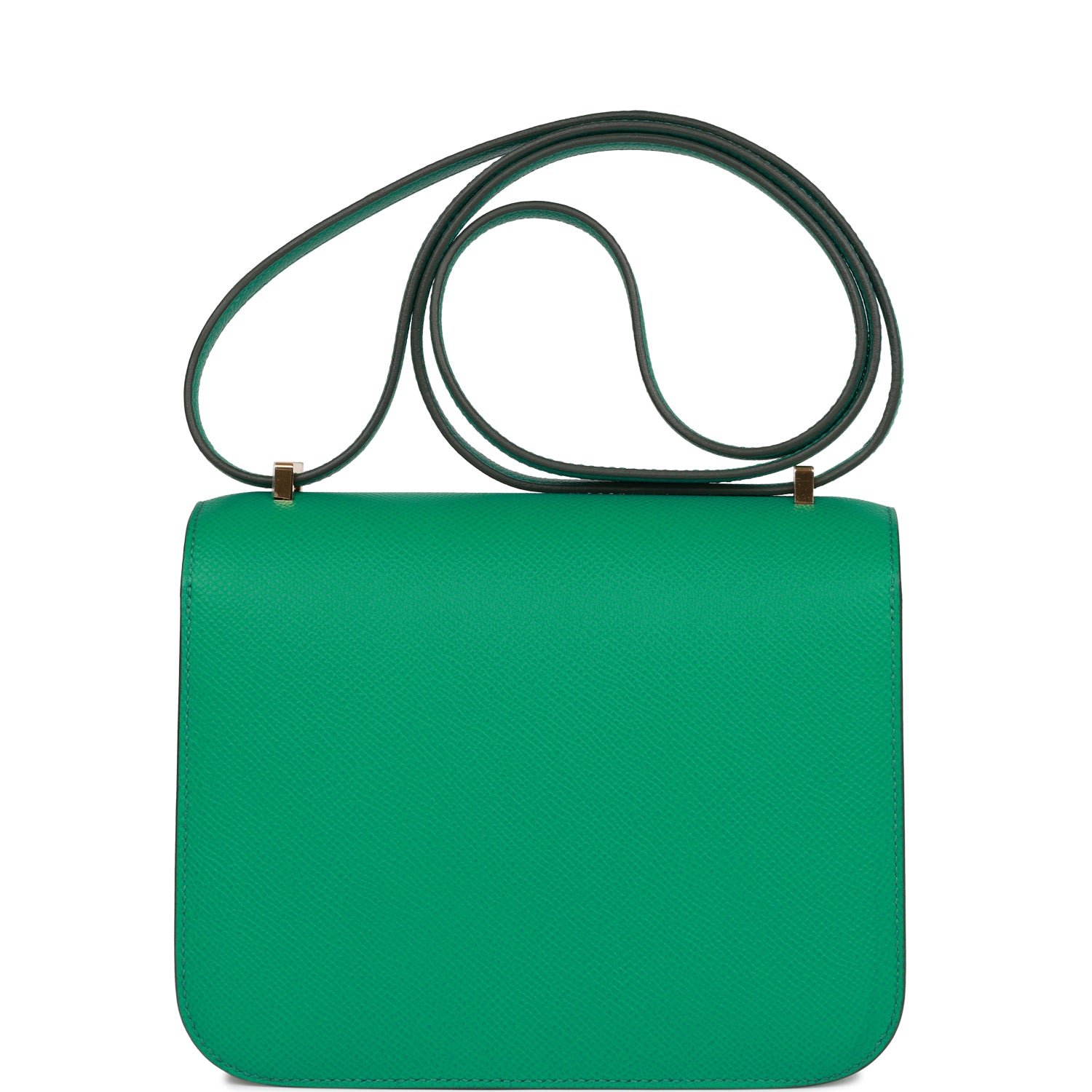 This Constance is in Vert Jade epsom leather with gold hardware and has tonal stitching. a metal H snap lock closure and adjustable shoulder strap.