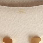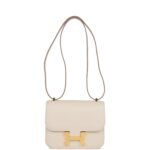 This Constance is in Craie epsom leather with gold hardware and has tonal stitching. a metal H snap lock closure and adjustable shoulder strap.