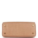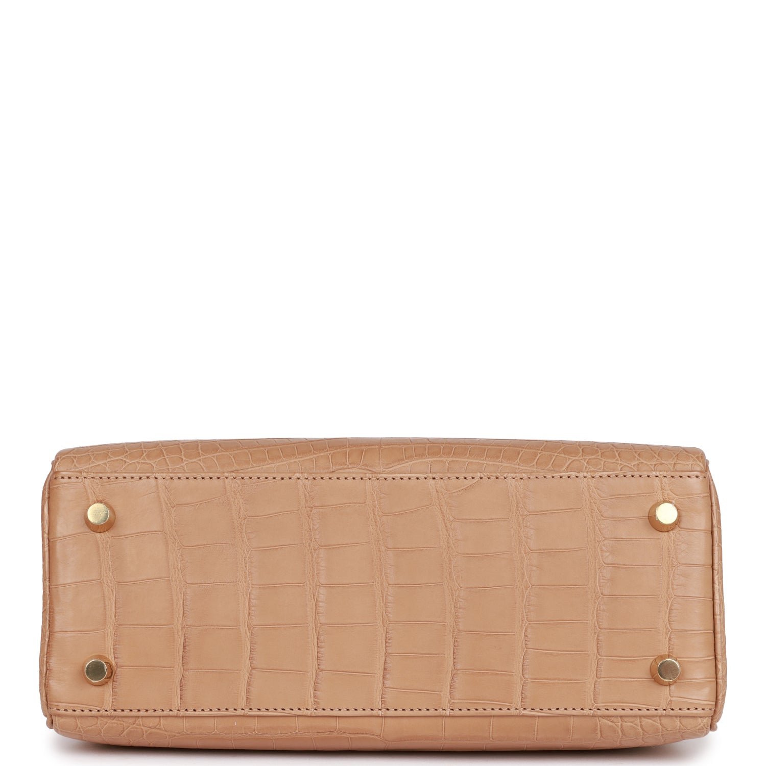 This Retourne Kelly is in Chai matte Mississippiensis alligator with gold hardware and has tonal stitching. front flap. two straps with center toggle closure. clochette with lock and two keys. single rolled handle and removable strap.