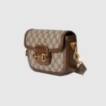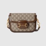 Petite versions of the Gucci Horsebit 1955 add a hybrid twist to the vintage inspired line. Enriched with two different shoulder straps, the mini bag’s character transforms from understated elegance with a tonal leather strap to a strong logo feel thanks to a red and green Web option. The accessory is presented in monogram canvas with a brown leather trim.