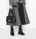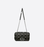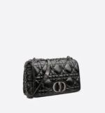 The Dior Caro bag combines modernity with timeless elegance. The design is crafted in black calfskin and is distinguished by its original quilted-effect Macrocannage stitching. The bag features a flap adorned with a ruthenium ‘CD’ twist clasp, inspired by the seal of a Christian Dior perfume bottle. The detachable chain shoulder strap with ‘CD’ signature links allows the large bag to be carried by hand or worn over the shoulder and may be replaced by one of the House’s wide embroidered straps for day or evening attire.
