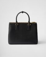 Production of the Prada Galleria bag, composed of 83 pieces, is an authentic fusion between industrial precision and the refined accuracy of craftsmanship that can only be performed by hand. The design is clean and elegant yet innately pragmatic, an aesthetic language blending form and function that combines history and modernity. Originating the definition of “timeless”, the Galleria bag has become a hallmark of Prada’s identity in the twenty-first century. The accessory, presented in the large version, is made of iconic Saffiano, a calf leather patented by Mario Prada that is resistant to scratches and water and defined by its crosshatch texture.