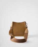 This versatile leather bag boasts a sleek and functional design. The shoulder strap adds a sporty element to the accessory, elevated by the metal logo lettering that stands out on the simple yet distinctive geometry of the iconic triangle.