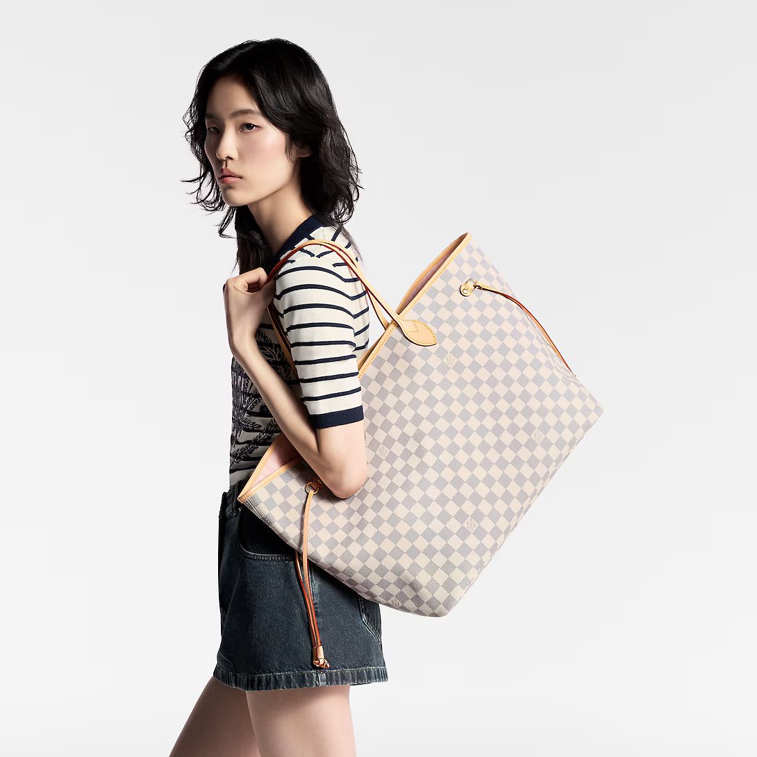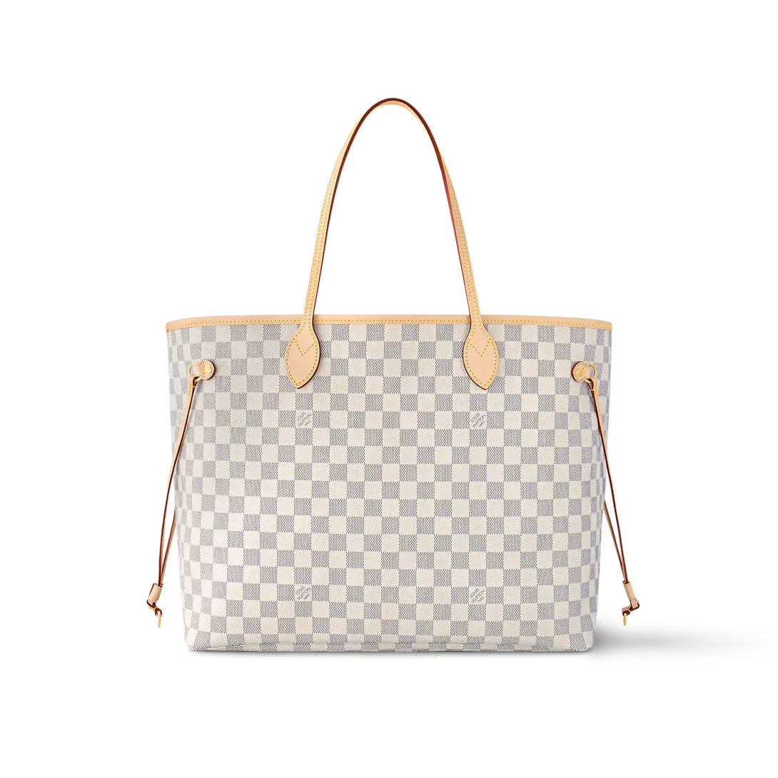 The Neverfull GM tote unites timeless design with heritage details. Crafted from fresh Damier Azur canvas with natural cowhide trim it is ultra-roomy yet never bulky with side laces that cinch for a sleek allure or loosen for a more casual look. Slim comfortable handles slip easily over the shoulder or arm. Lined in colorful textile it features a removable pouch which can serve as a clutch or an extra pocket.