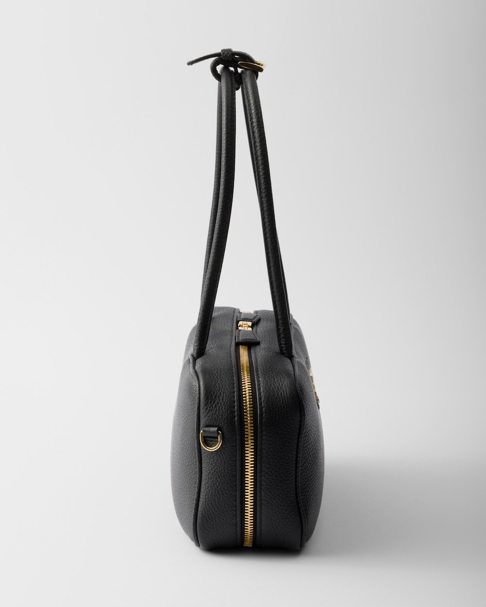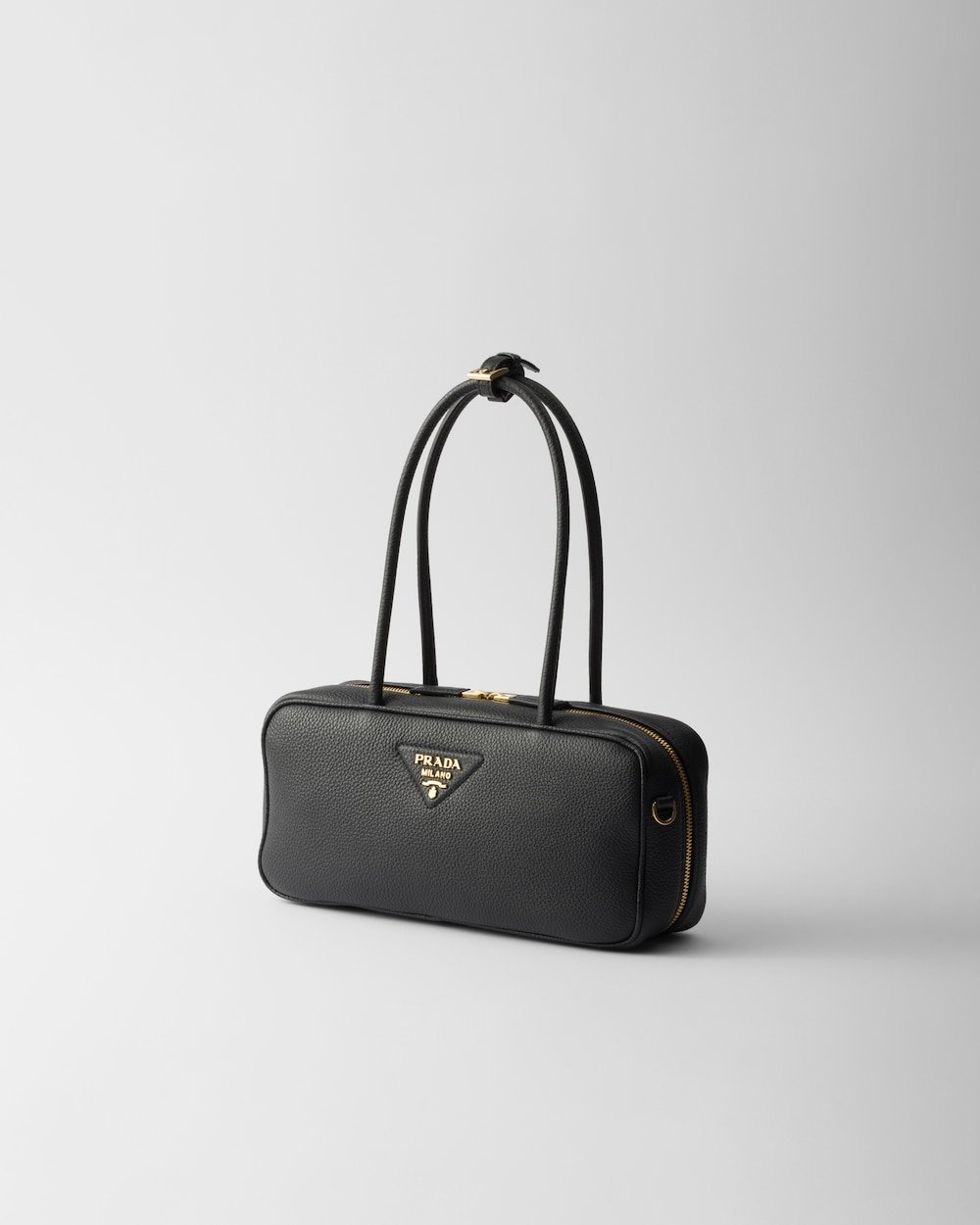 This leather top-handle bag features a modern design with refined details and a versatile style. Its sleek geometric silhouette, complemented by long handles for effortless wear on the shoulder, is enhanced with metal logo lettering.