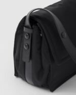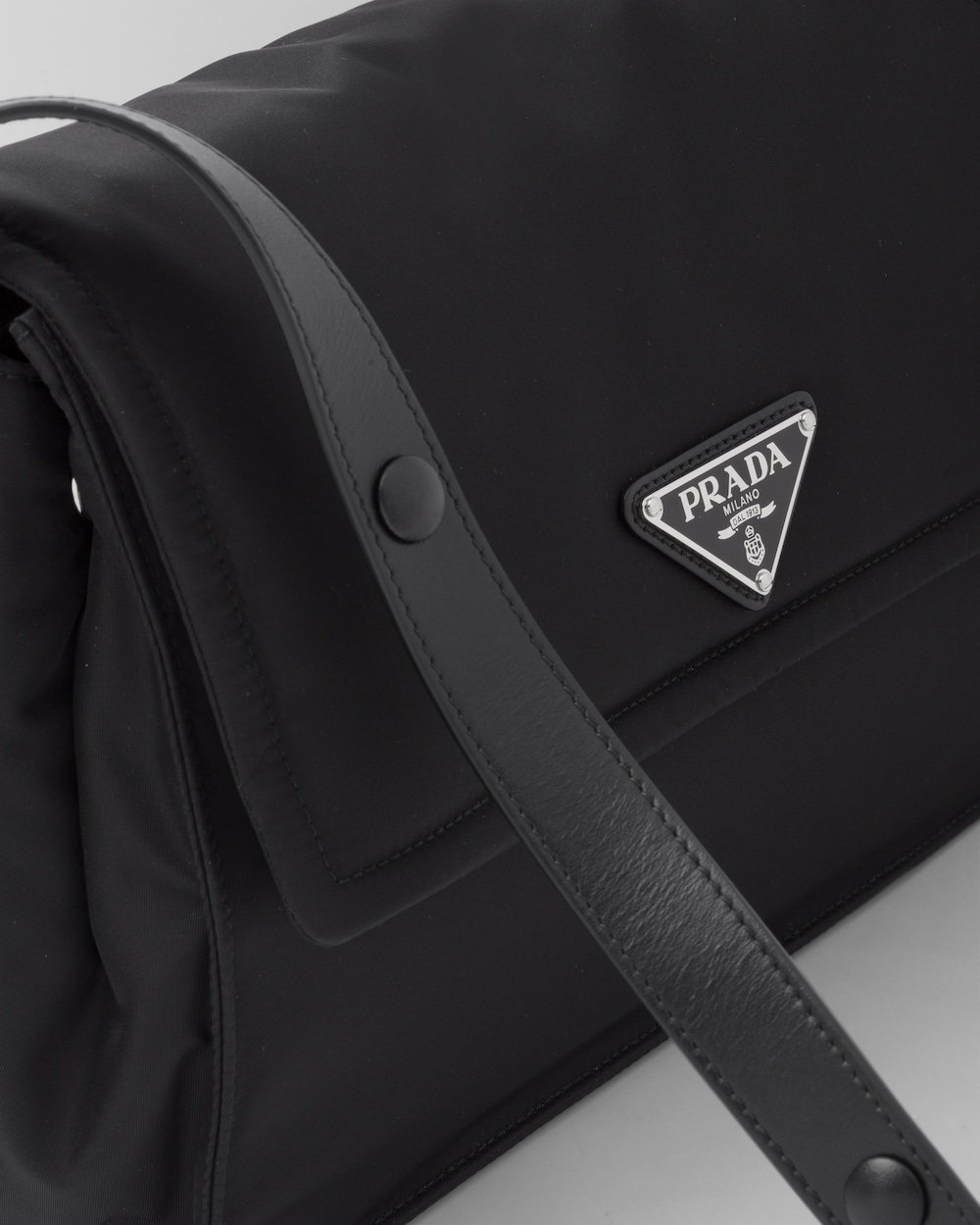 This shoulder bag made of padded Re-Nylon, the distinctive innovative material of the brand, comes with a leather shoulder strap. The accessory completed by a back pocket is illuminated with metal hardware and is decorated with the enameled metal triangle logo that stands out on the flap.
