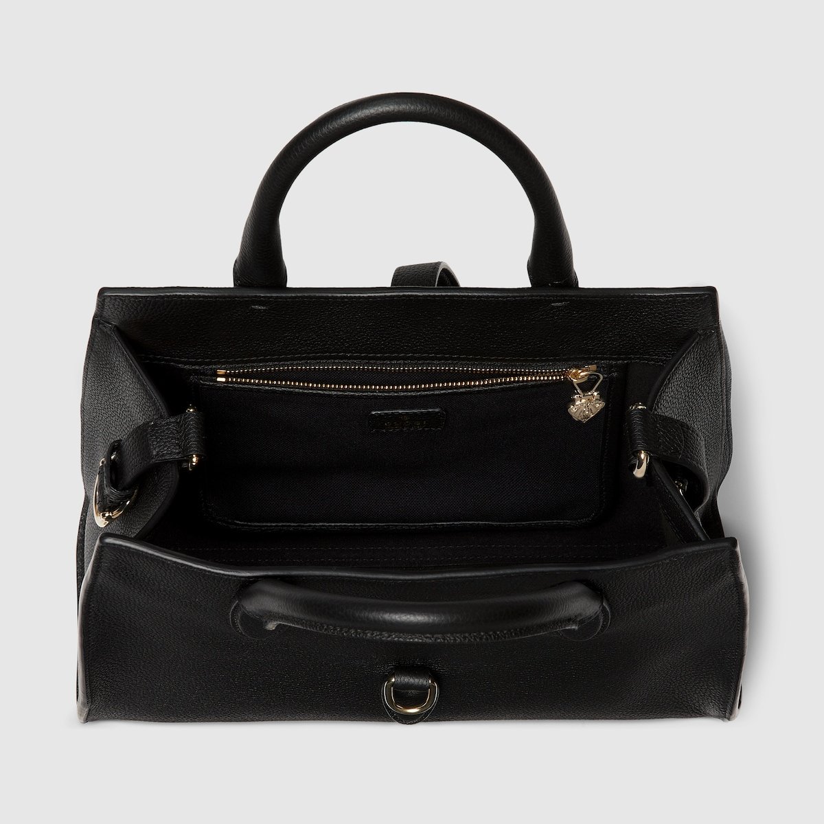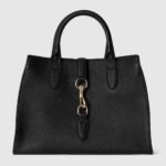 This medium tote design continues to feature the snap hook closure, first introduced in the Spring Summer 2024. The sophisticated leather in black has a distinctive natural grain. The top handle bag’s open compartment has a hook closure strap, and comes with a detachable and adjustable shoulder strap.