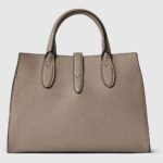 This medium tote design continues to feature the snap hook closure, first introduced in the Spring Summer 2024. The sophisticated leather in taupe has a distinctive natural grain. The top handle bag’s open compartment has a hook closure strap, and comes with a detachable and adjustable shoulder strap.