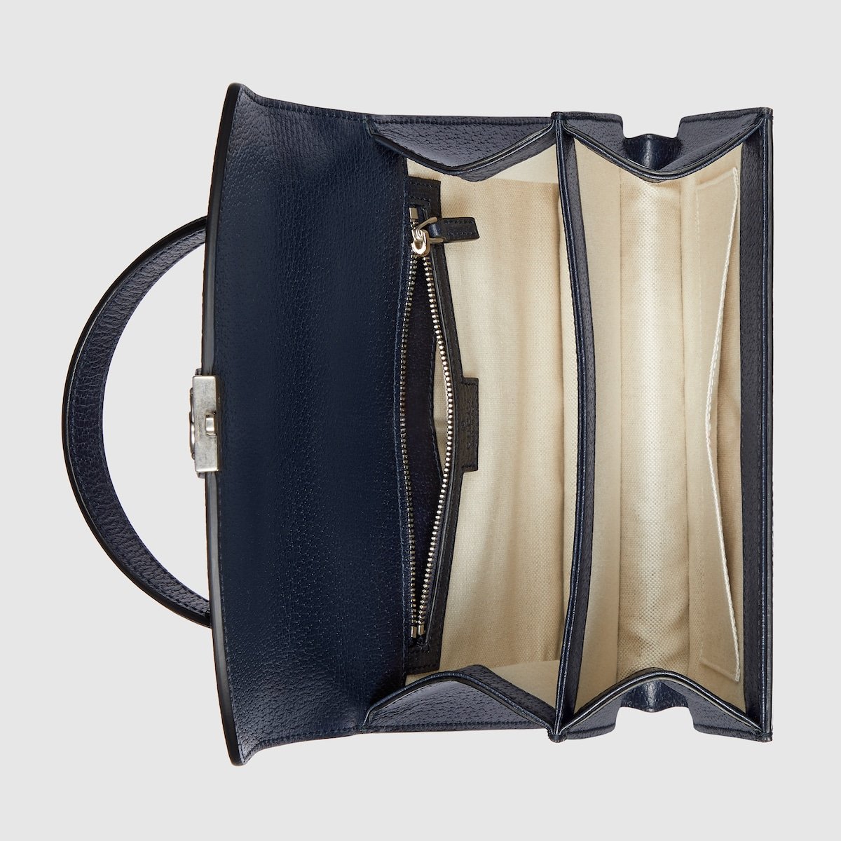 Mirroring the material’s historic origins, GG Supreme is introduced in a timeless mix of blue and beige for Gucci Love Parade. The canvas has come to the front of each collection decade after decade to become a hallmark of the House. Here, the classic palette defines this small-sized Ophidia top handle bag.