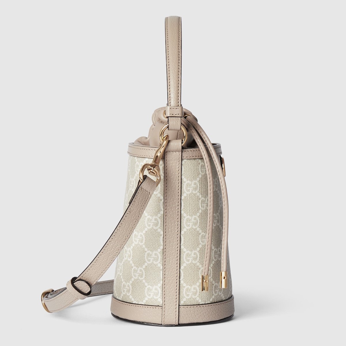 The Ophidia line is further elevated through new sizes and styles including variations with top handles as well as shoulder straps, allowing for versatile wear. The signature Double G hardware completes this mini bucket bag in a light gold against a beige and white GG Supreme canvas base.
