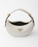 This sleek leather bag has a versatile, modernist allure. The accessory with a sinuous silhouette is completed by the leather extension and detachable shoulder strap for wearing different ways. The bag with nappa leather interior and metal hardware is embellished with the enameled metal triangle logo on the front.