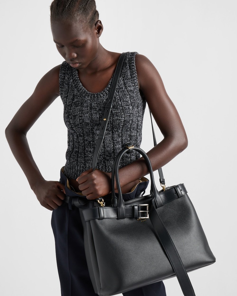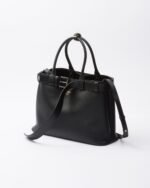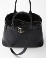 Clean lines and refined elements express Prada’s dual aesthetic that moves between simplicity and detail, functionality and elegance. This leather bag with nappa interior summarizes the stylistic codes of the brand in a pragmatic yet sophisticated design. The roomy silhouette is characterized by a multifaceted soul, expressed by the interchangeable belt that enriches the accessory with a unique and contemporary touch. The lettering logo, embossed in 22 karat gold leaf, decorates the modern, versatile style.