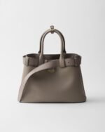 Clean lines and refined elements tell the story of Prada’s dual aesthetic that moves between simplicity and detail, functionality and elegance. This leather bag with nappa interior summarizes the stylistic codes of the brand in a pragmatic yet sophisticated design. The silhouette is characterized by a multifaceted soul, expressed by the interchangeable belt that enriches the accessory with a unique and contemporary touch. The lettering logo, embossed in 22 karat gold leaf, decorates the modern, versatile style.