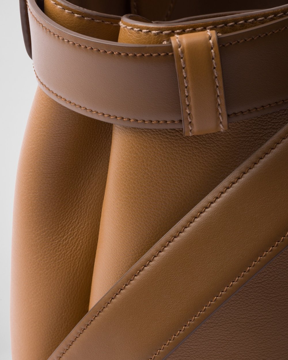 Clean lines and refined elements tell the story of Prada’s dual aesthetic that moves between simplicity and detail, functionality and elegance. This leather bag with nappa interior summarizes the stylistic codes of the brand in a pragmatic yet sophisticated design. The silhouette is characterized by a multifaceted soul, expressed by the interchangeable belt that enriches the accessory with a unique and contemporary touch. The lettering logo, embossed in 22 karat gold leaf, decorates the modern, versatile style.