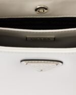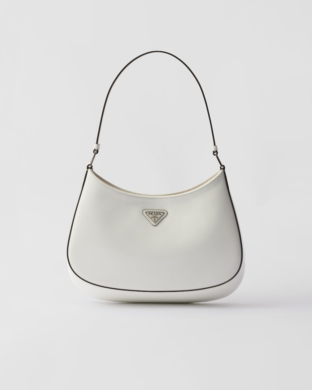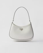 The Prada Cleo bag with sophisticated allure reinterprets an iconic design of the brand from the 1990’s. Sleek curved lines emphasized by the particular construction rounded on the bottom and sides give this hobo bag a soft, light look. Brushed leather, a modern and versatile material that is distinctive in Prada collections, is ideal for creating always new combinations and contrasts. The enamel triangle logo decorates the silhouette.