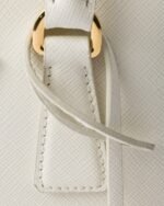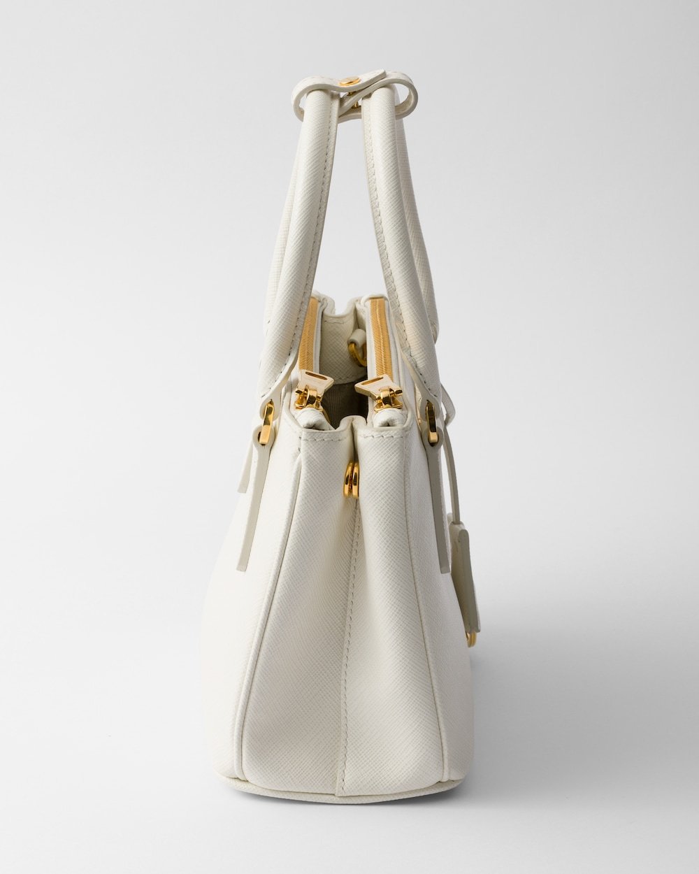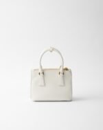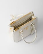 Production of the Prada Galleria bag, composed of 83 pieces, is an authentic fusion between industrial precision and the refined accuracy of craftsmanship that can only be performed by hand. The design is clean and elegant yet innately pragmatic, an aesthetic language blending form and function that combines history and modernity. Originating the definition of “timeless”, the Galleria bag has become a hallmark of Prada’s identity in the twenty-first century. The accessory, presented in the mini version, is made of iconic Saffiano leather that was patented by the founder of the brand and features a crosshatch texture and waxed finish.