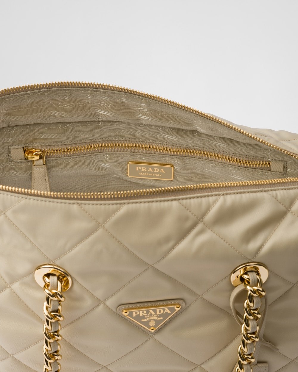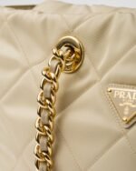 A re-edition of an iconic style of 1995, this shoulder bag summarizes Prada codes in a casual, versatile silhouette that establishes a dialog between stylistic languages of past and present. The design with soft volumes is made of Re-Nylon, the innovative regenerated nylon yarn, defined by iconic stitching that reveals a geometric pattern. The leather and metal chain handles complete the accessory with vintage charm, decorated with the enameled metal triangle logo.