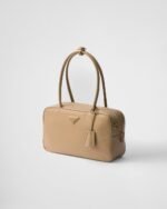 This structured top-handle bag, crafted from Re-Nylon and leather, presents a timeless silhouette with sophisticated charm. The metal hardware and the enameled metal triangle logo adorn the style, while the zipper and padlock closure add a unique accent.