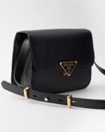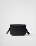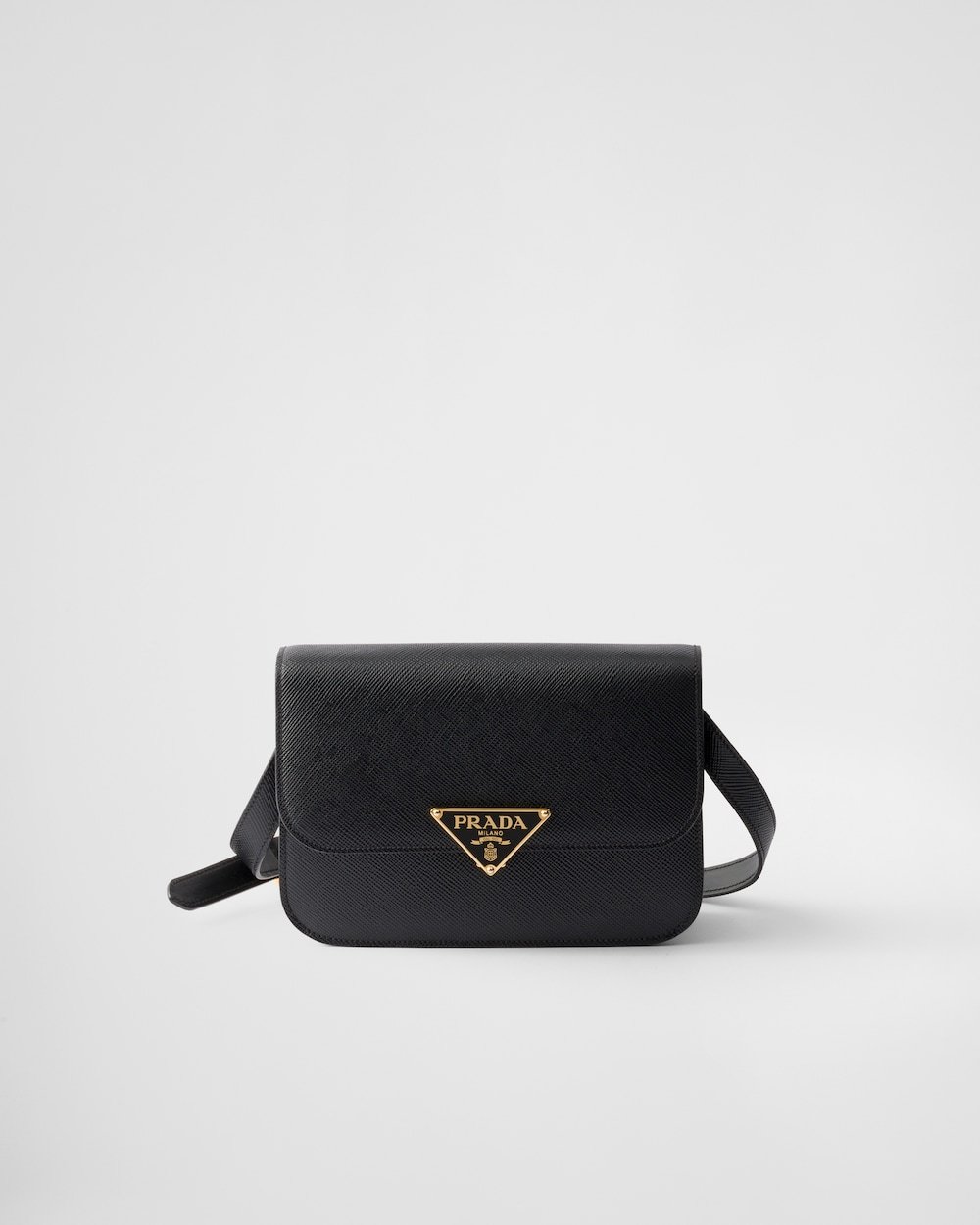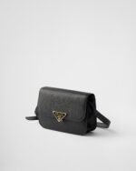 This shoulder bag plays with the concept of simplicity in its lines and compact size, combining versatility and elegance in a refined design. The bag made of Saffiano leather comes with an adjustable shoulder strap enriched with metal hardware, like the iconic triangle logo embellishing the clasp.