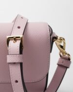The unmistakable crosshatch pattern with waxed finish of Saffiano leather, Prada’s iconic material, embellishes this mini bag with a sleek, sophisticated silhouette. The compact style with adjustable shoulder strap has an elegant removable chain handle for versatile wear. The accessory brightened by metal hardware is completed by the distinctive signature of the enameled metal triangle logo.