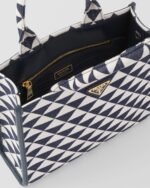 Introduced for the first time on trunks designed by Mario Prada, the Prada triangle expresses uniqueness and modernity through its universal, minimalist shape that is reinvented in a different way each season. Here, the geometric design is transformed into a sophisticated yet modernist pattern that plays with contrasting colors and decorates this sleek tote bag. Details in the brand’s iconic Saffiano leather embellish the design completed by a detachable shoulder strap that allows it to be worn in different ways.