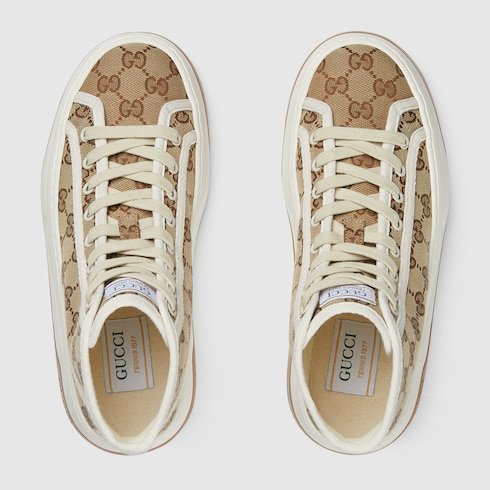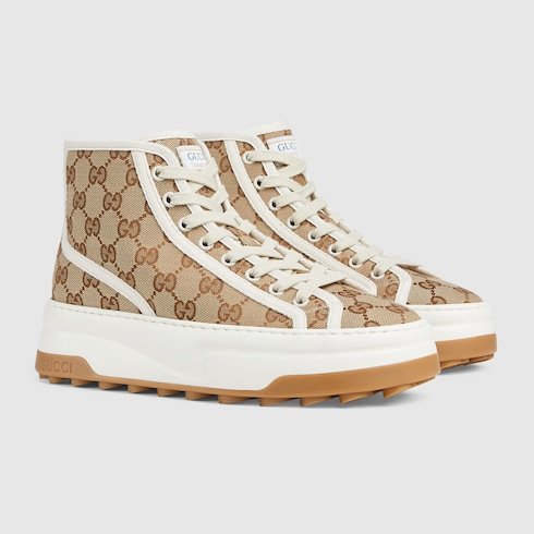A striking silhouette that takes inspiration from the tennis courts. Presented in a classic beige and ebony Original GG canvas, this high top sneaker features a chunky sole and a contrasting fabric trim for a contemporary aesthetic.