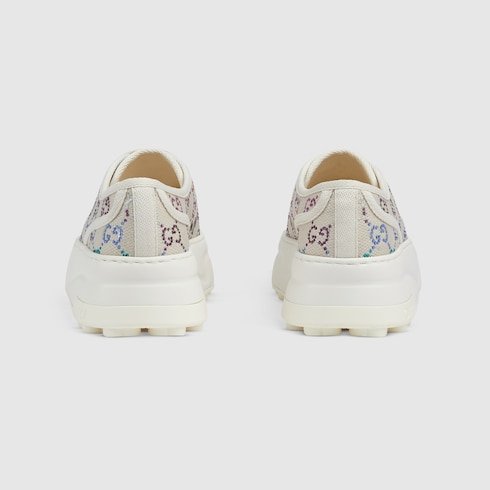 A striking silhouette that takes inspiration from the tennis courts. Presented in off white canvas with GG crystals, this low-top sneaker features a chunky sole and a contrasting trim for a contemporary aesthetic.